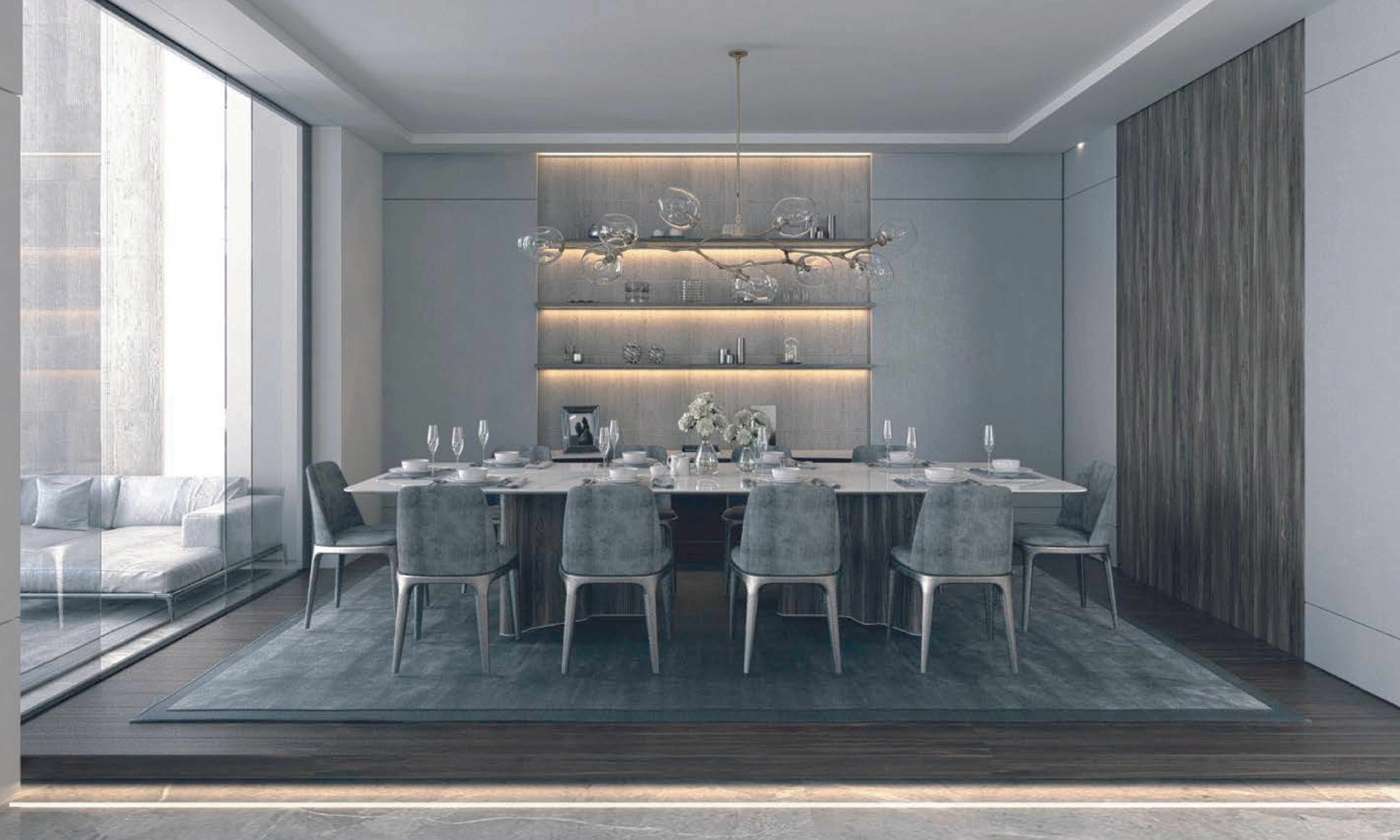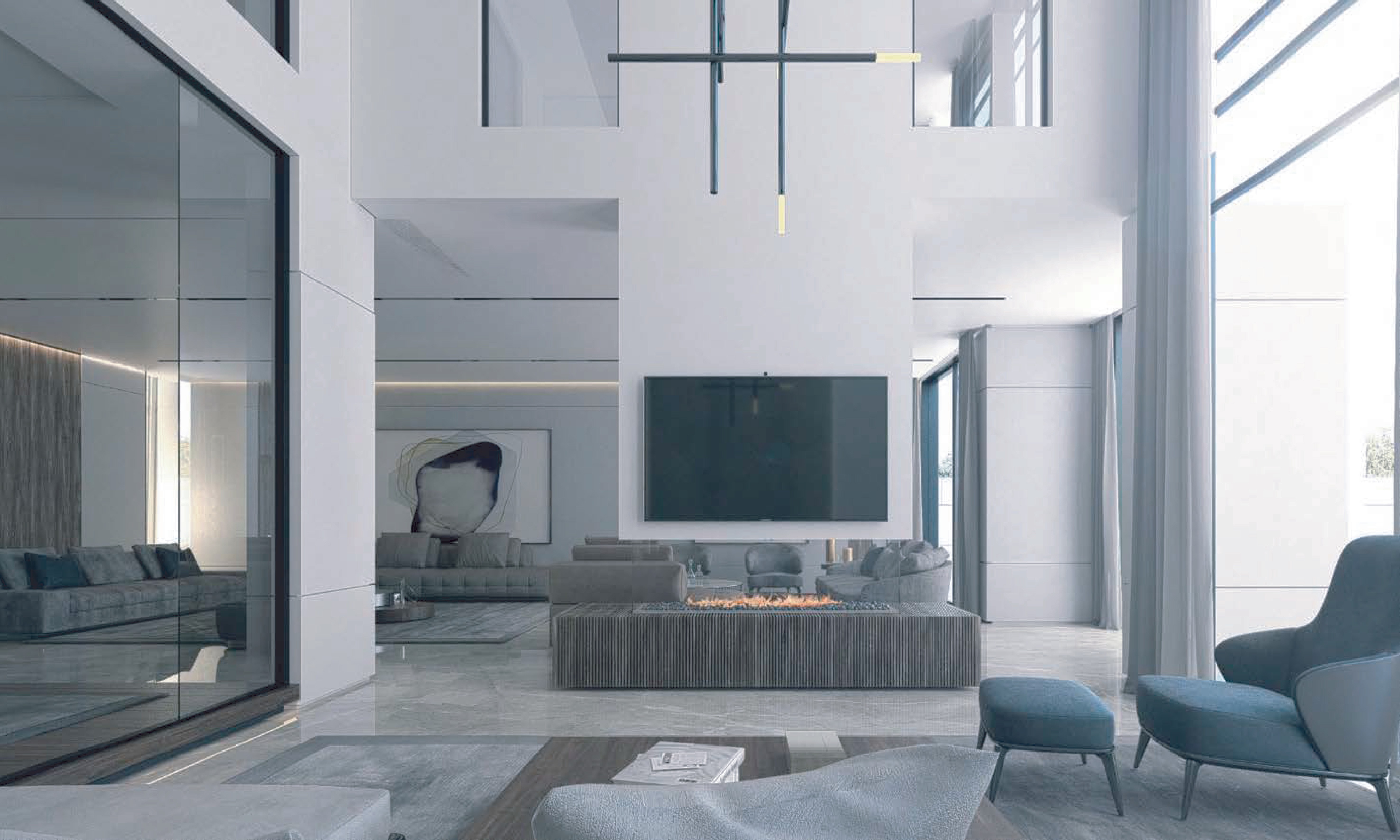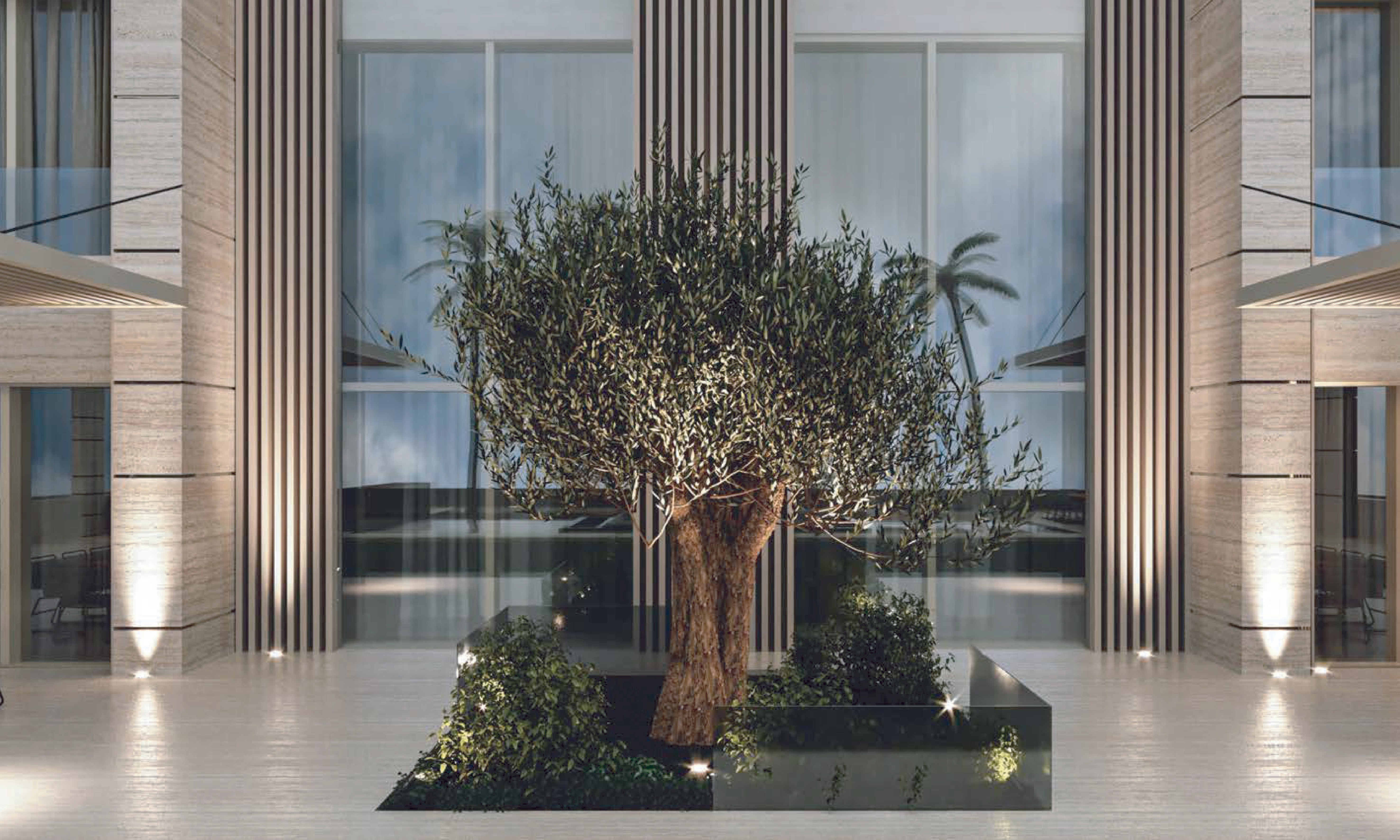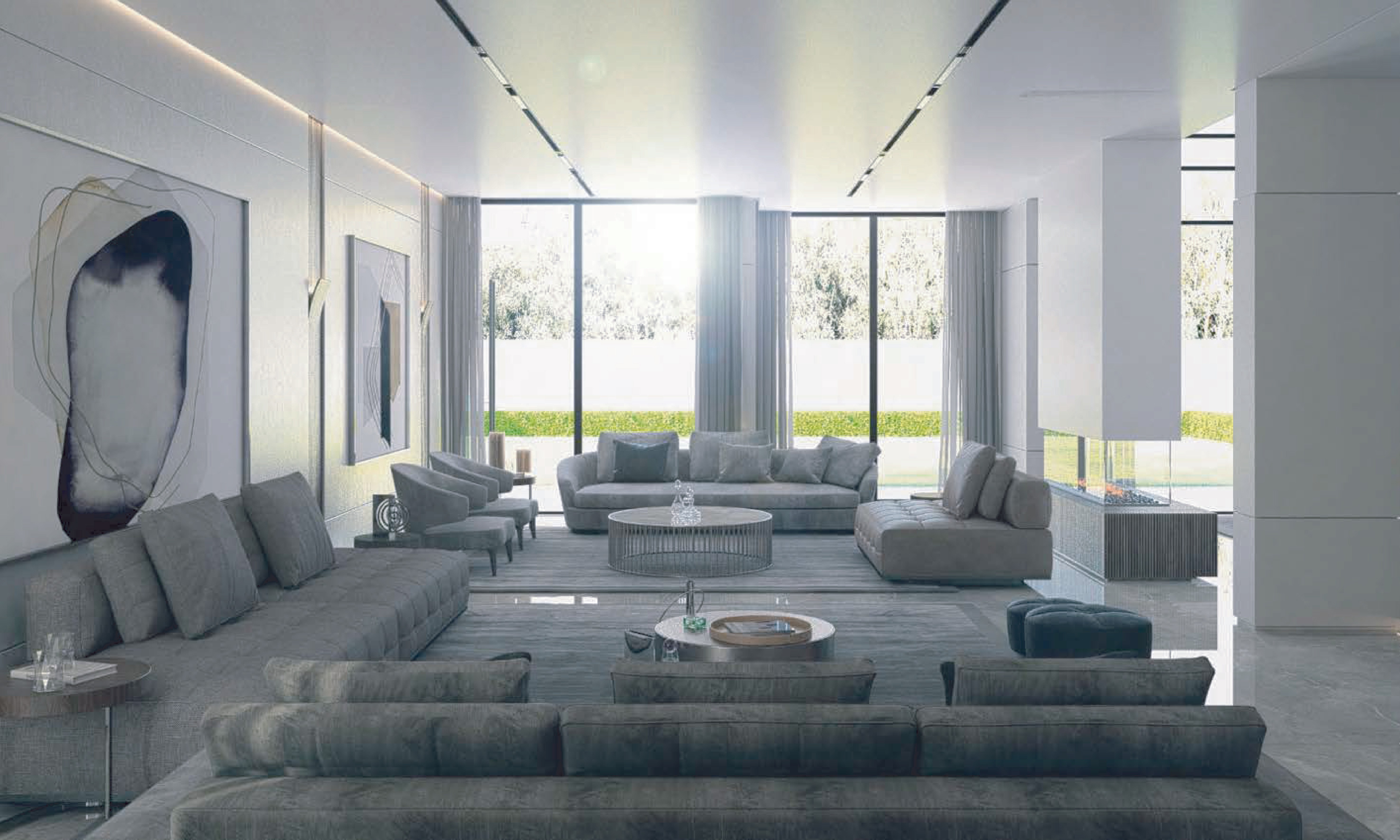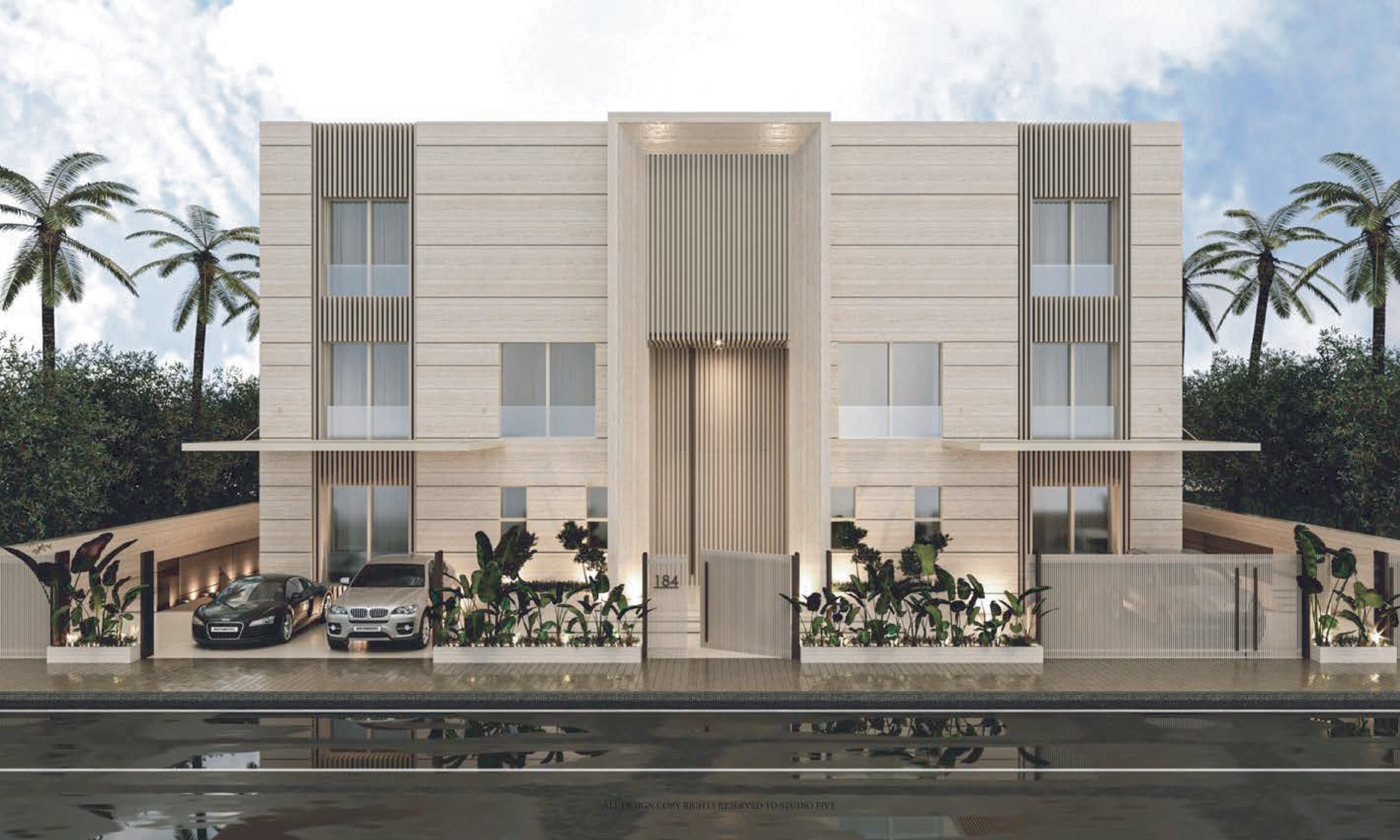 The grand central entrance makes a bold statement, while the surrounding greenery softens the structure, adding warmth to the modern design. Flanked by sleek carports, this residence is an epitome of understated sophistication, seamlessly merging luxury with functional design.