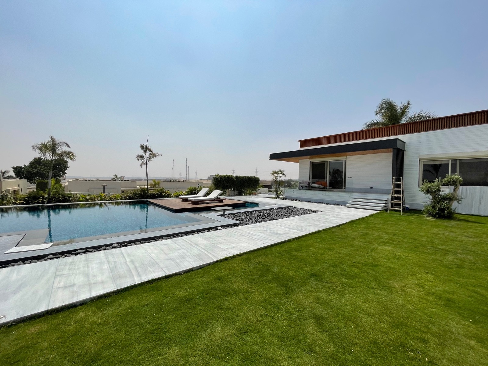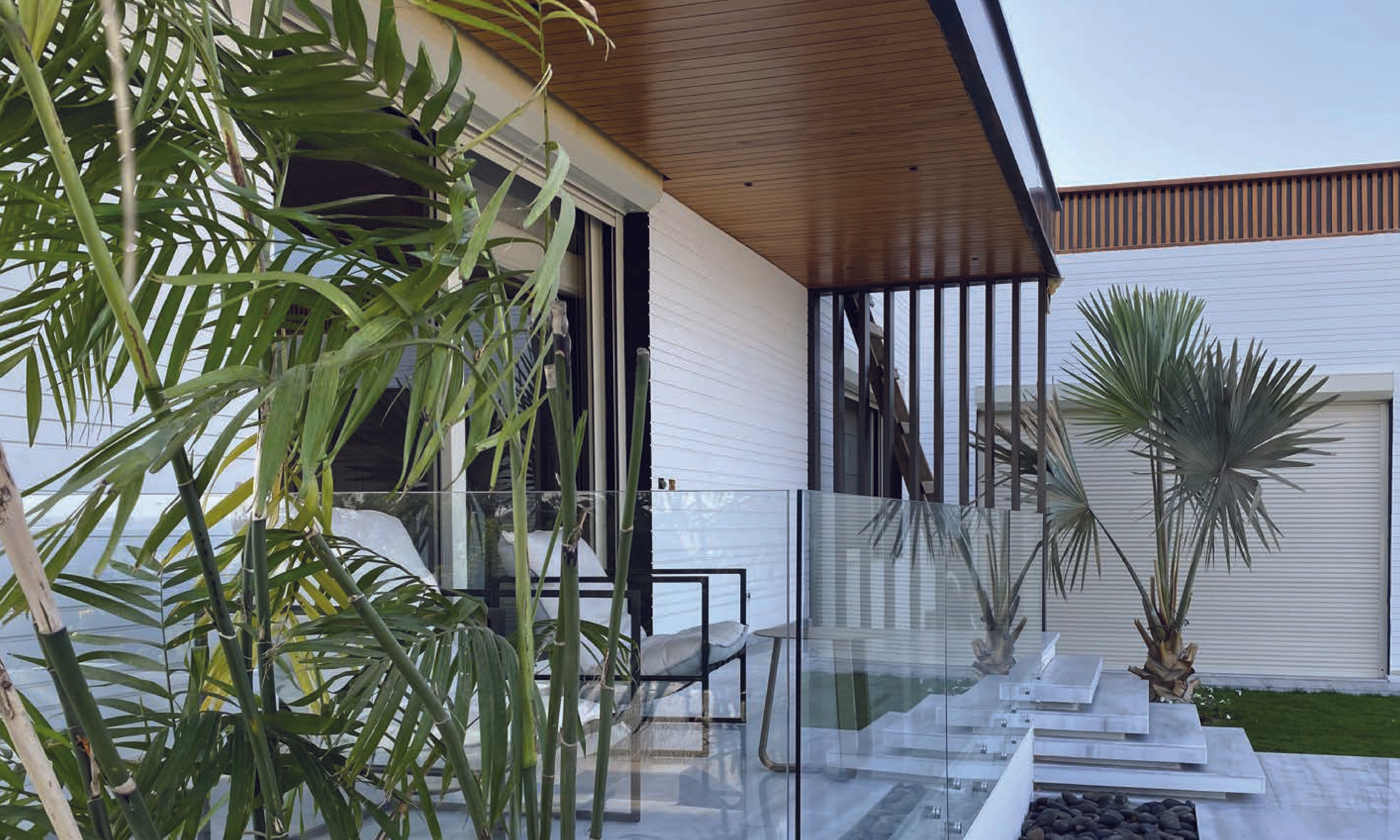 Large windows connect the open-plan interior to lush outdoor spaces, while an infinity-edge pool with a wooden deck adds sophistication; making this home a seamless blend of modern style and natural harmony.