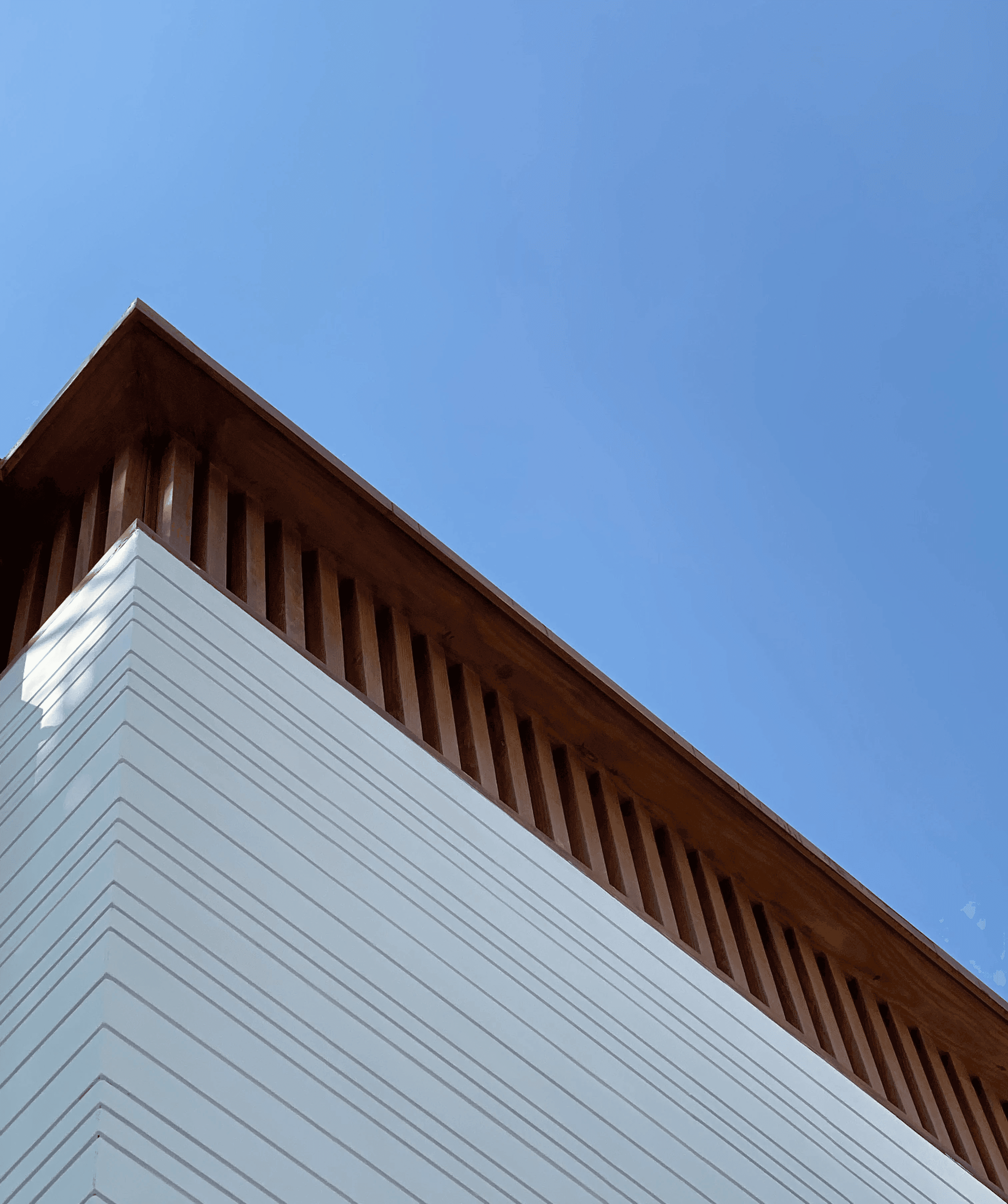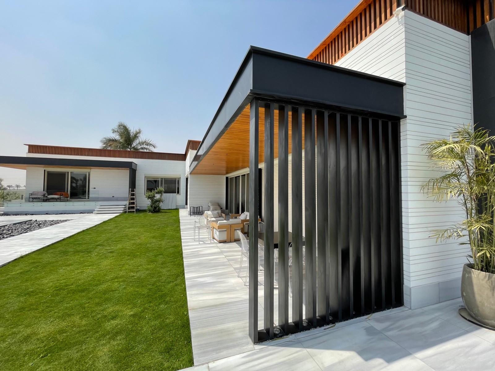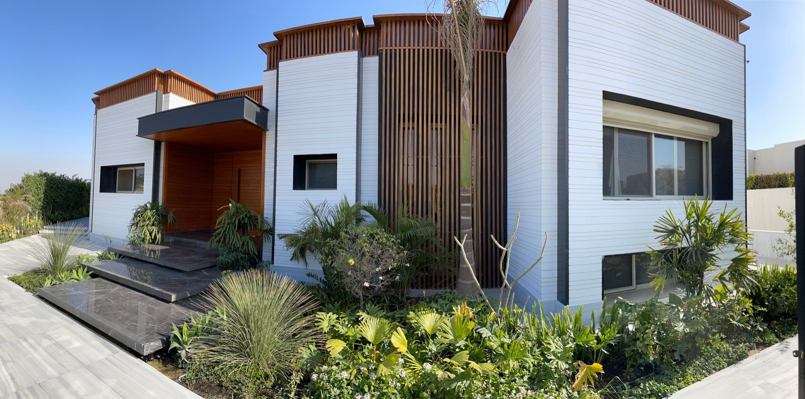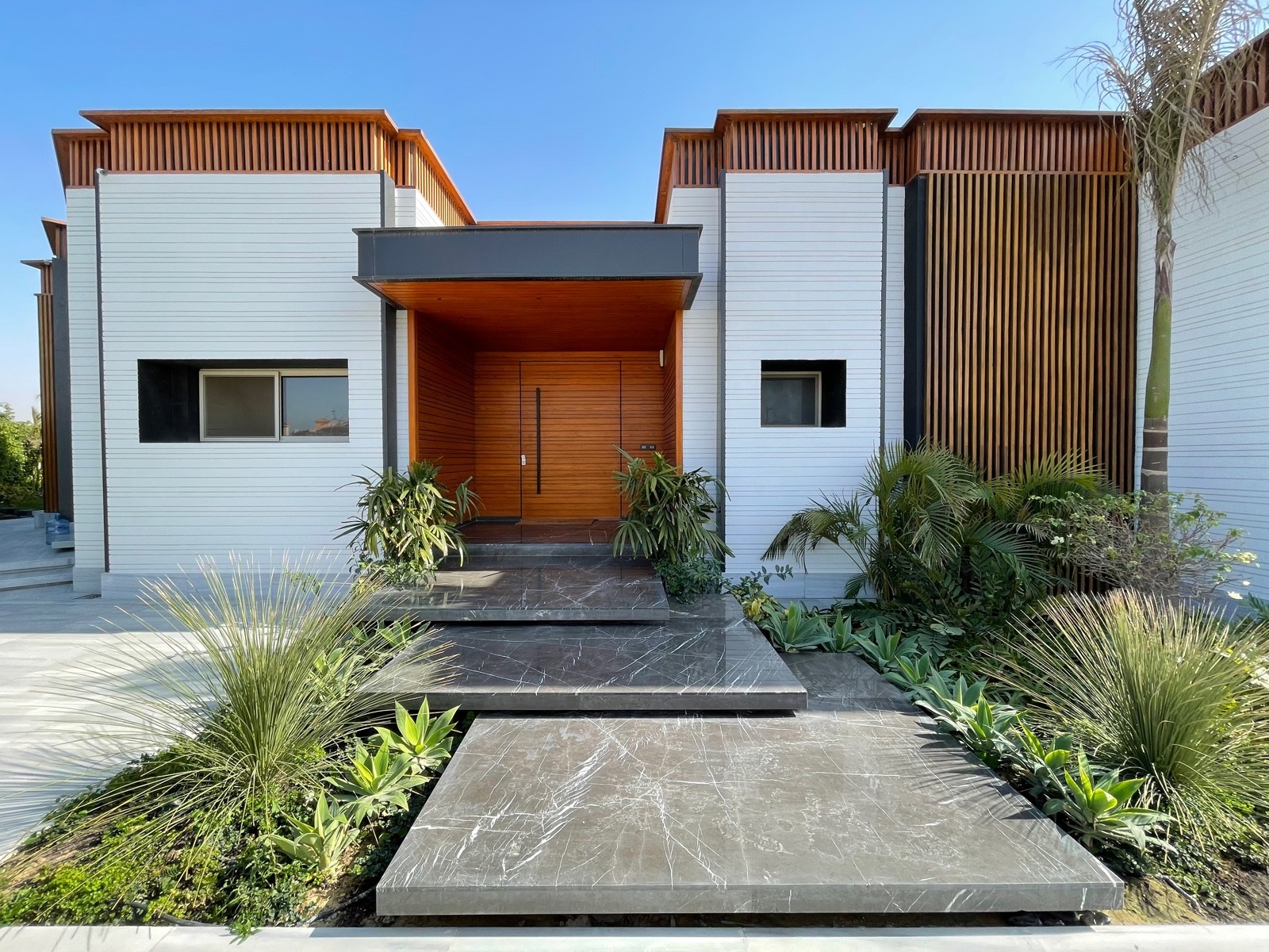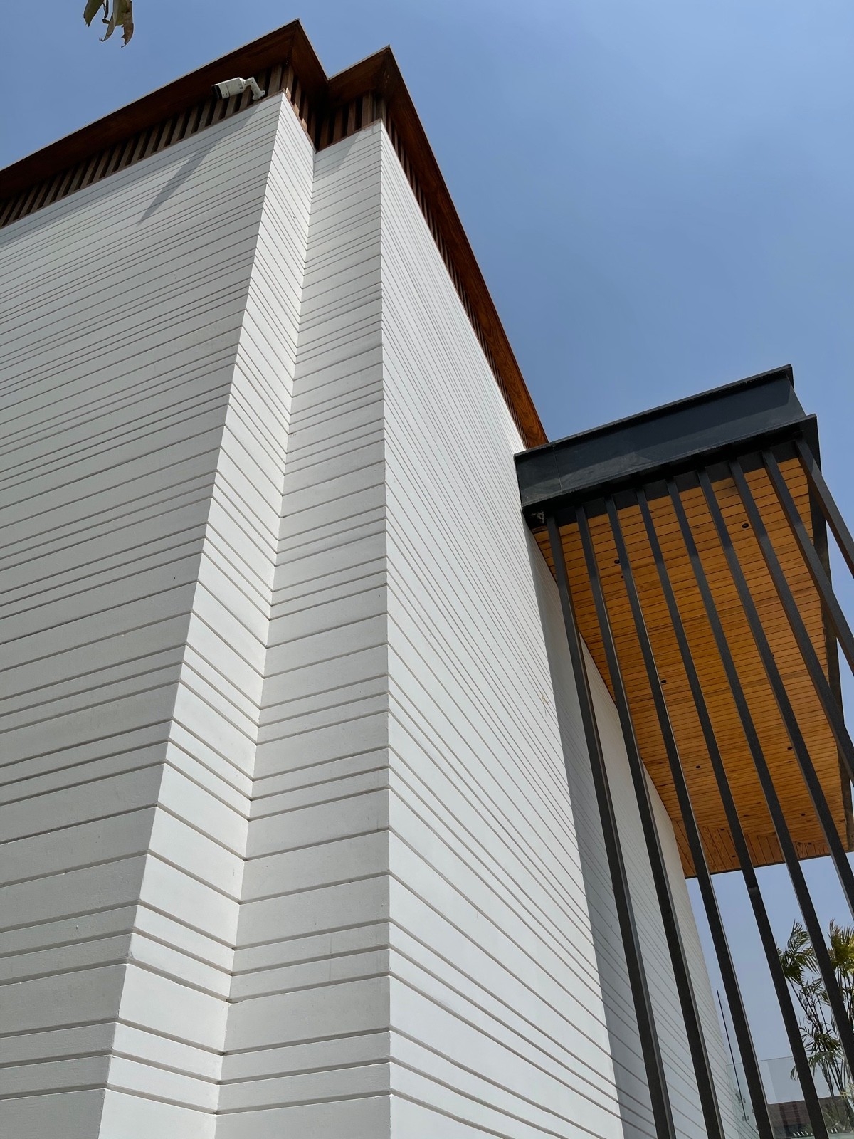 The design concept for this house emphasizes modern minimalism with clean lines, a neutral color palette, and natural materials like wood and marble to create warmth and elegance. The facade blends vertical wooden slats with sleek horizontal panels, highlighted by recessed lighting for a dynamic look.